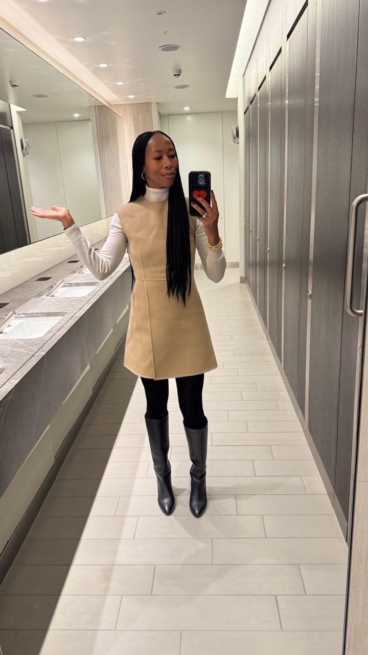 I don’t often wear minis, especially in the workplace but this is easily toned down with black knee high boots, tights and a cream roll neck – refer to point above, see I told you; hardworking